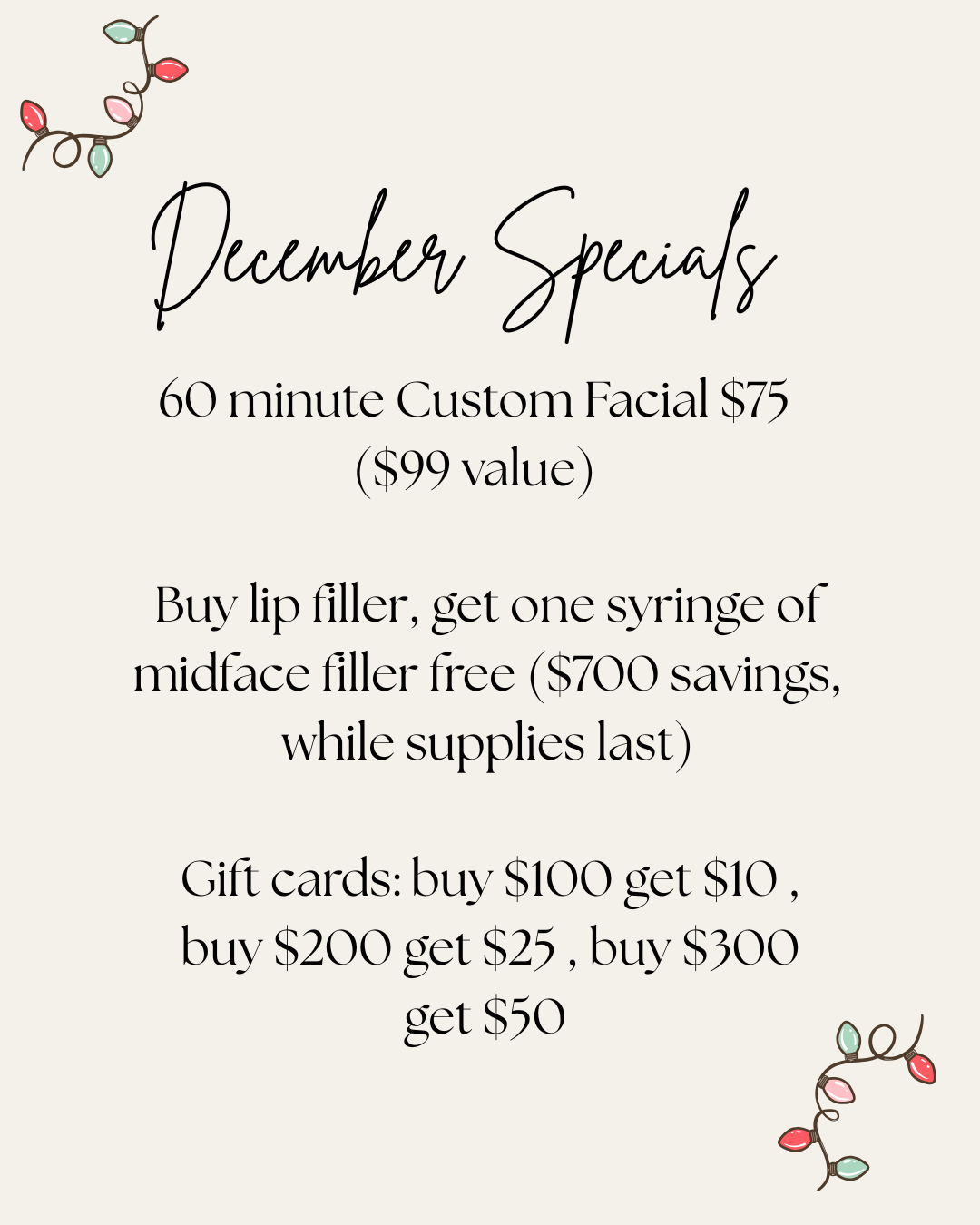 We have three great specials this month just in time for the holidays. Get a 60 minute custom facial for $75 ($99 value). Purchase lip filler and get one syringe of midface filler free ($700 value). Finally, buy $100 in gift cards get $10, buy $200 get $25 and buy $300 get $50.