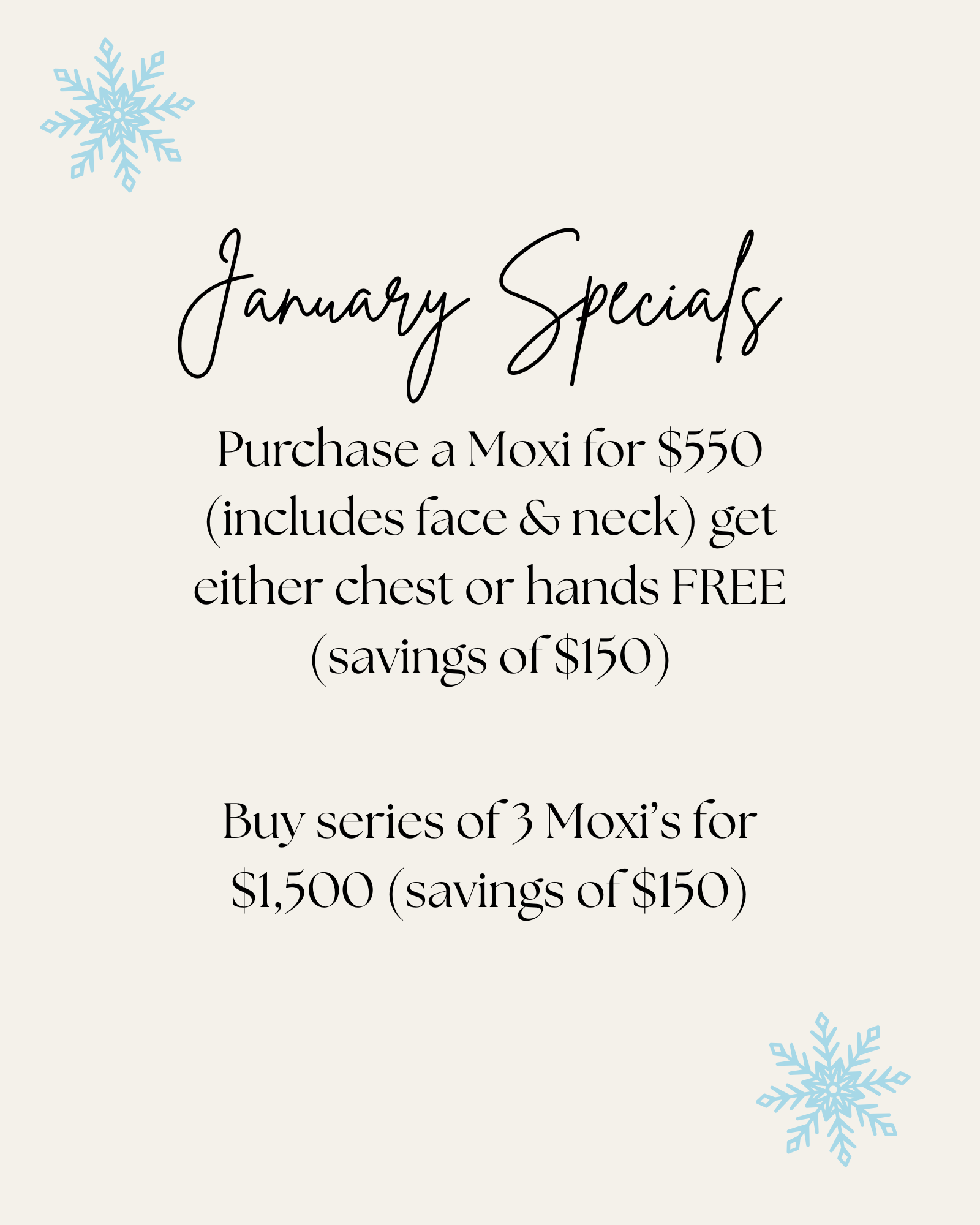 One of our favorite treatments is on special this month! The Moxi laser; a non-ablative fractional laser treatment that gently resurfaces the skin to improve texture, tone, and overall radiance with minimal downtime. It’s often used to address early signs of aging, sun damage, and pigmentation by stimulating collagen production in the skin. Buy one at normal price ($550) get chest OR hands free OR buy a series of three for $1,500 ($150 savings).
